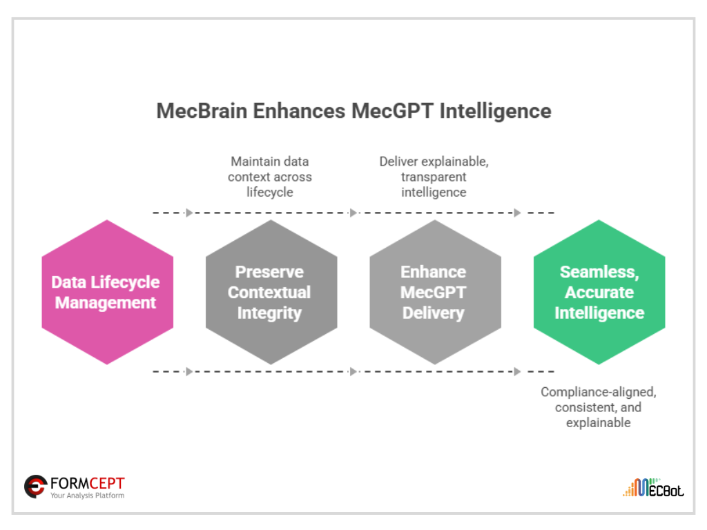 Because each insight is derived from well-governed, auditable data, enterprises achieve both agility and accountability. MecBrain preserves contextual integrity across the data lifecycle, allowing MecGPT to deliver explainable, transparent, and compliance-aligned intelligence with seamless accuracy and consistency, just in time.